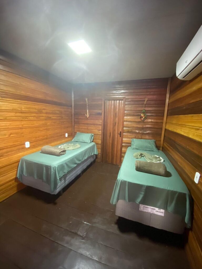 Os quartos são confortáveis e climatizados, com capacidade para casais, famílias e grupos de pescadores. As varandas e áreas de convivência, decoradas com móveis artesanais e elementos regionais, proporcionam uma experiência genuinamente amazônica — simples, acolhedora e sofisticada na medida certa.
